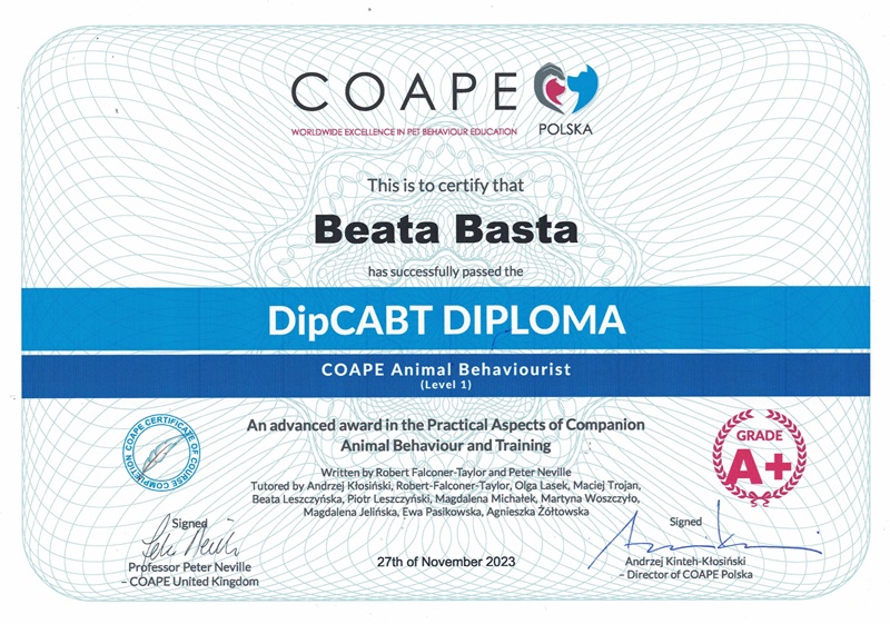 Z każdym rokiem przybywa coraz więcej zwierząt reagujących nadmiernym strachem, agresją, cierpiących z powodu fobii oraz wykazujących zaburzenia lękowe. Ustalenie przyczyny zachowania jest niezbędne do podjęcia prawidłowej terapii. Wszelkie problemy zdrowotne oraz ból towarzyszący wielu chorobom wywołują niepokój i mogą przyczyniać się do rozwoju zaburzeń zachowania. Pierwszym krokiem leczenia zaburzeń behawioralnych jest dokładny wywiad oraz badanie kliniczne mające na celu potwierdzić bądź wykluczyć przyczyny medyczne danego zachowania. Jako lekarz weterynarii - behawiorysta COAPE w trakcie prowadzenia terapii modyfikacji zachowania łączę wiedzę z zakresu behawiorystki zwierząt oraz medycyny weterynaryjnej.