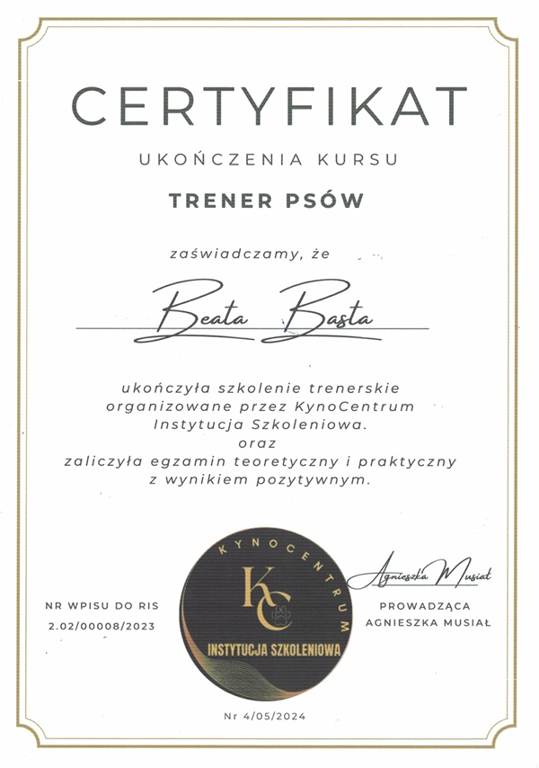 mgr inż. zootechniki, behawiorysta COAPE, zoopsycholog i instruktor szkolenia psów Karolina Żyła tel. 608 687 486